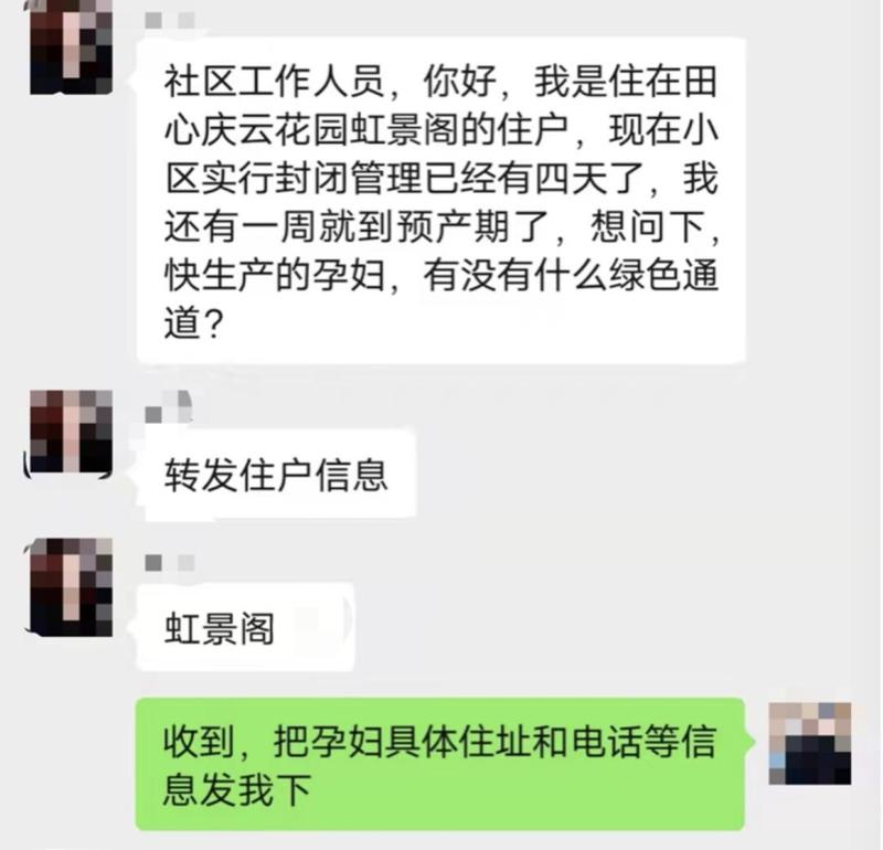 1月14日晚,在田心社区疫情防控群中,一条信息引起了工作人员的关注:“社区人员你好,我是田心庆云花园虹景阁的住户,现在小区实行封闭管理已有四天了,我还有一周就到预产期了,想问下,快生产的孕妇有没有什么绿色通道?”