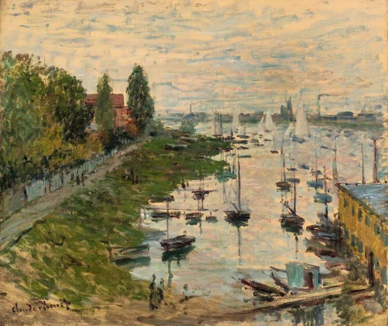 《阿让特伊的港口》是莫奈在桥上画的,展示的是一个港口普通的风景,但印象派的特质表现得很明显,水天都是明亮的色彩,用短笔触非常快速地画出来,阳光充满了他的画布。同样的题材,据说莫奈画了 170 多幅。