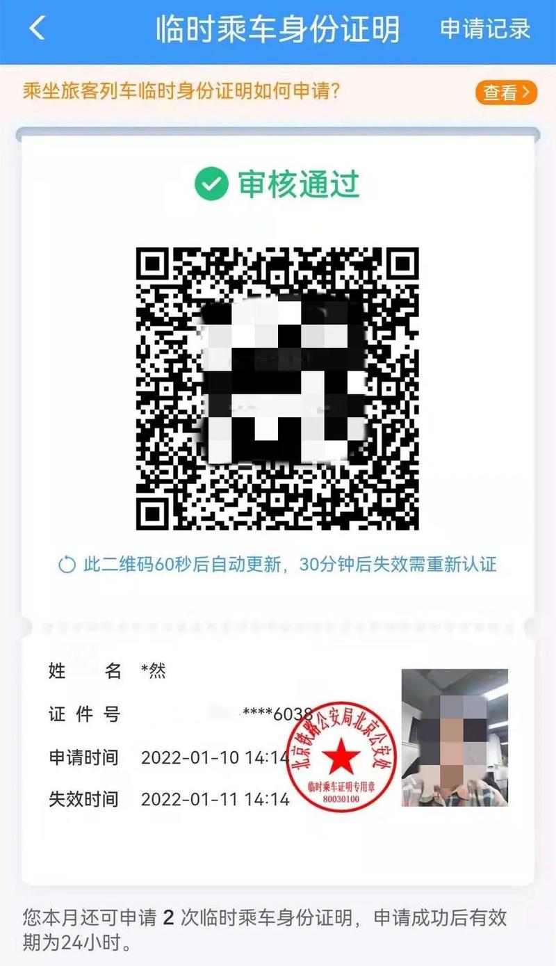 为了避免他人冒用,在电子临时乘车身份证明二维码使用页面停留30分钟后,需要用户重新通过实人核验确定本人操作。在临时乘车身份证明有效期内,该操作不占用申请次数。