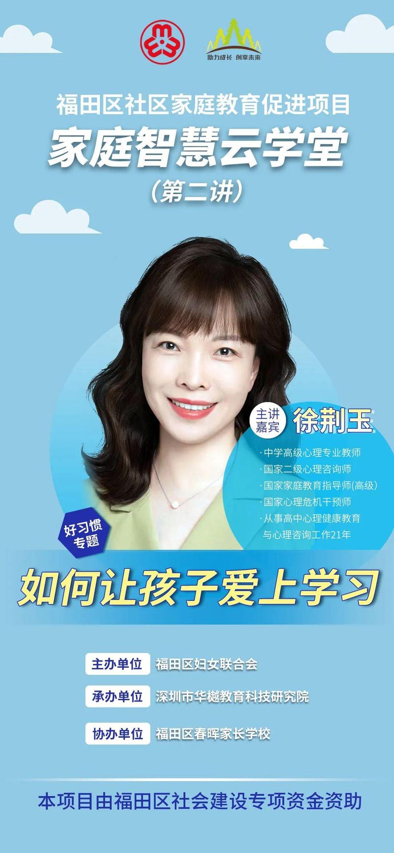 为深入贯彻实施《中华人民共和国家庭教育促进法》,宣传普及家庭教育知识,由福田区妇女联合会主办,深圳市华樾教育科技研究院承办的福田区社区家庭教育促进项目“家庭智慧云学堂”系列课程开讲啦!