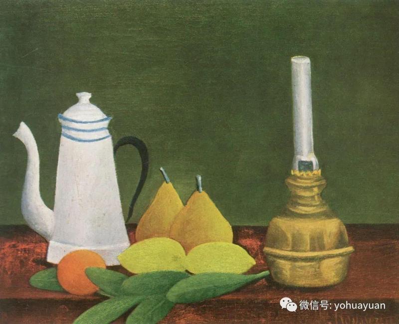 但卢梭却以对称的方式把分开,并在中间摆上高矮与形状相似的水果,从而使画面上的两个主题巧妙的连接起来,弥补可能造成的分散的缺点,烛台与水壶也形成呼应。