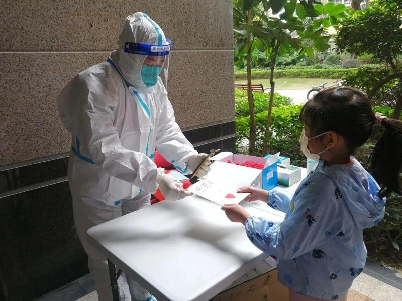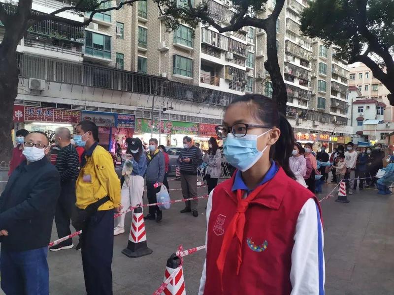在莲塘社区的志愿者队伍中,有一个身影,引起了核酸检测队伍的注意,她身穿校服,红马甲下系着红领巾,她是新秀小学六年级学生黄颖宜,任务是协助检查检测人员的健康码。