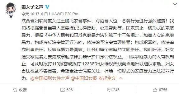 陕西省妇联随后也就此事发布消息,称高度关注王鹏飞家暴事件,对施暴人这一恶劣行为进行强烈谴责!将根据受暴当事人需要,提供法律援助、心理帮助等。