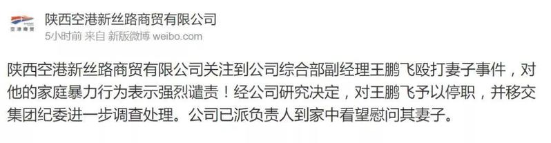 陕西空港新丝路商贸有限公司关注到公司综合部副经理王鹏飞殴打妻子事件,对他的家庭暴力行为表示强烈谴责!经公司研究决定,对王鹏飞予以停职,并移交集团纪委进一步调查处理。公司已派负责人到家中看望慰问其妻子。