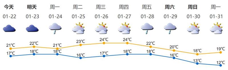 ● 1月22日,阴天间多云,有分散小雨,早晚有轻雾;气温17—21℃;东风3—4级,沿海、高地和海区阵风6级;相对湿度75%—95%。1月23日—24日,多云转小雨;1月25—26日,多云,可见阳光。
