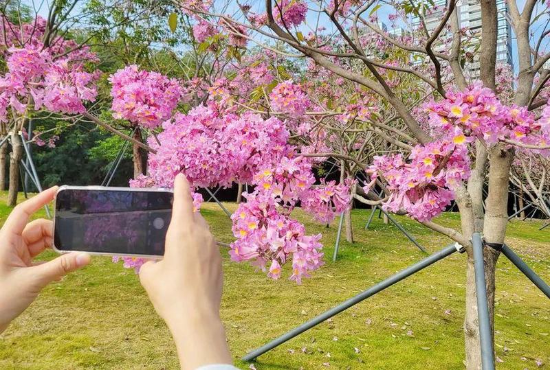“今天过来散步,看到两岸花开,新春就要到了,心情格外开心”。21日上午,蛇口居民陈女士推着孙子在南山区中心河景观提升工程一期散步,连连与盛开的紫花风铃木自拍。