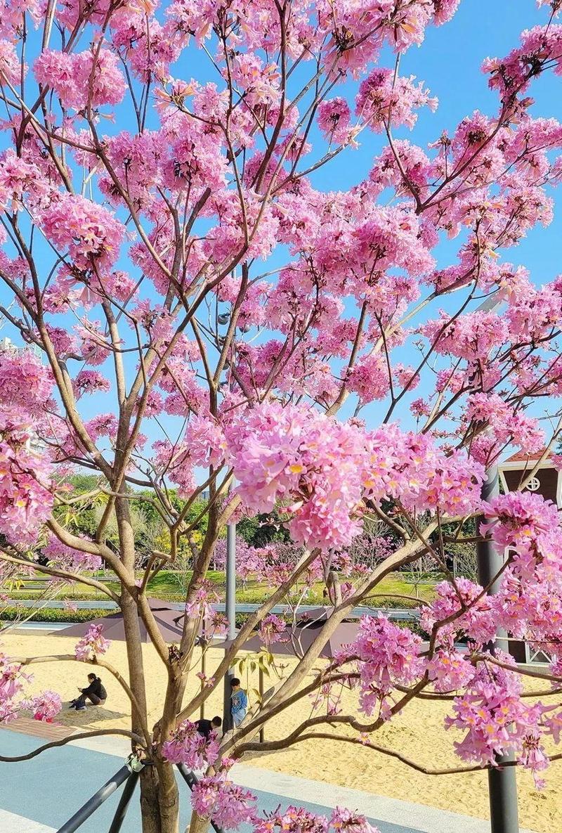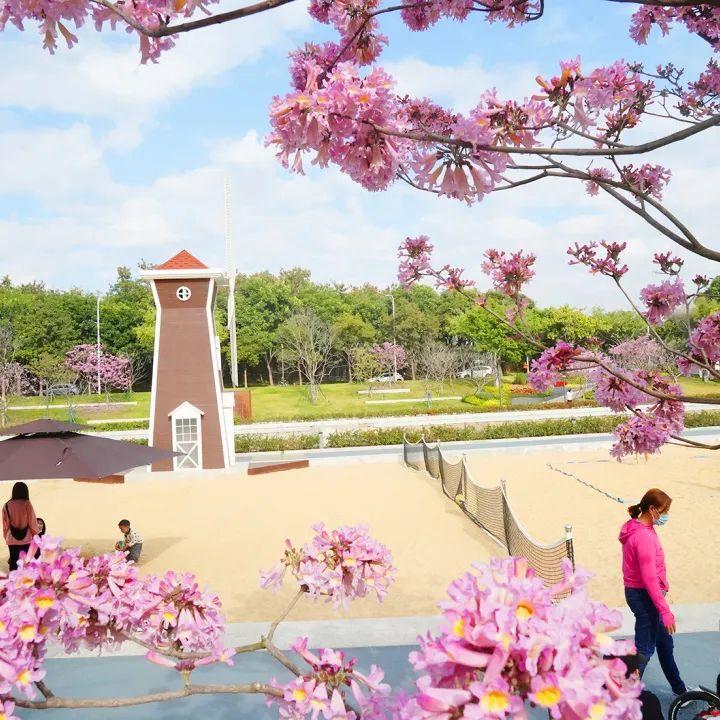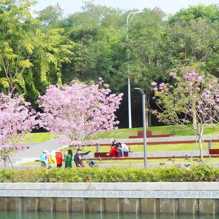 春天的脚步临近,深圳天气逐渐转暖。中心河两岸一排排紫花风铃木绚烂绽放,形成了一河碧水、两岸花开的美丽盛景。不少市民来此打卡游玩,学生在沙滩上玩起了沙滩排球,尽情享受着公园美景。