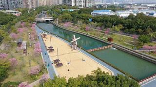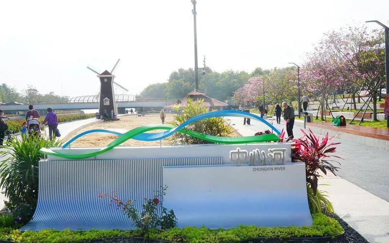 一期建设了风车塔、阳光沙滩、出海口儿童乐园等特色景观节点;设置了廊架光伏板发电、风车风力发电、太阳能无线充电座椅等绿色低碳装置以及漫步道,打造“低碳”滨水公共空间示范点,实现了景观与治水、低碳与生态、儿童友好与全龄共享“三结合”;园区内,种植了紫花风铃木、火焰木等特色景观乔木,风光旖旎。