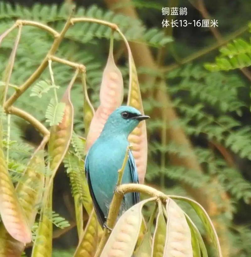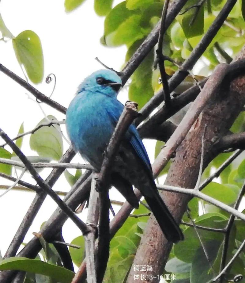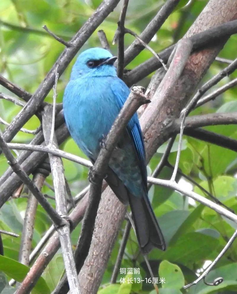 铜蓝鹟,小型鸟类,体长13~16厘米,雄鸟通体为鲜艳的铜蓝色,雌鸟和雄鸟大致相似,但不如雄鸟羽色鲜艳。 铜蓝鹟常单独或成对活动,多在高大乔木冠层,也到林下灌木和小树上活动,但很少下到地上。性大胆,不甚怕人,频繁地飞到空中捕食飞行性昆虫,也能像山雀一样在枝叶间觅食。鸣声悦耳,早晨和黄昏鸣叫不息。