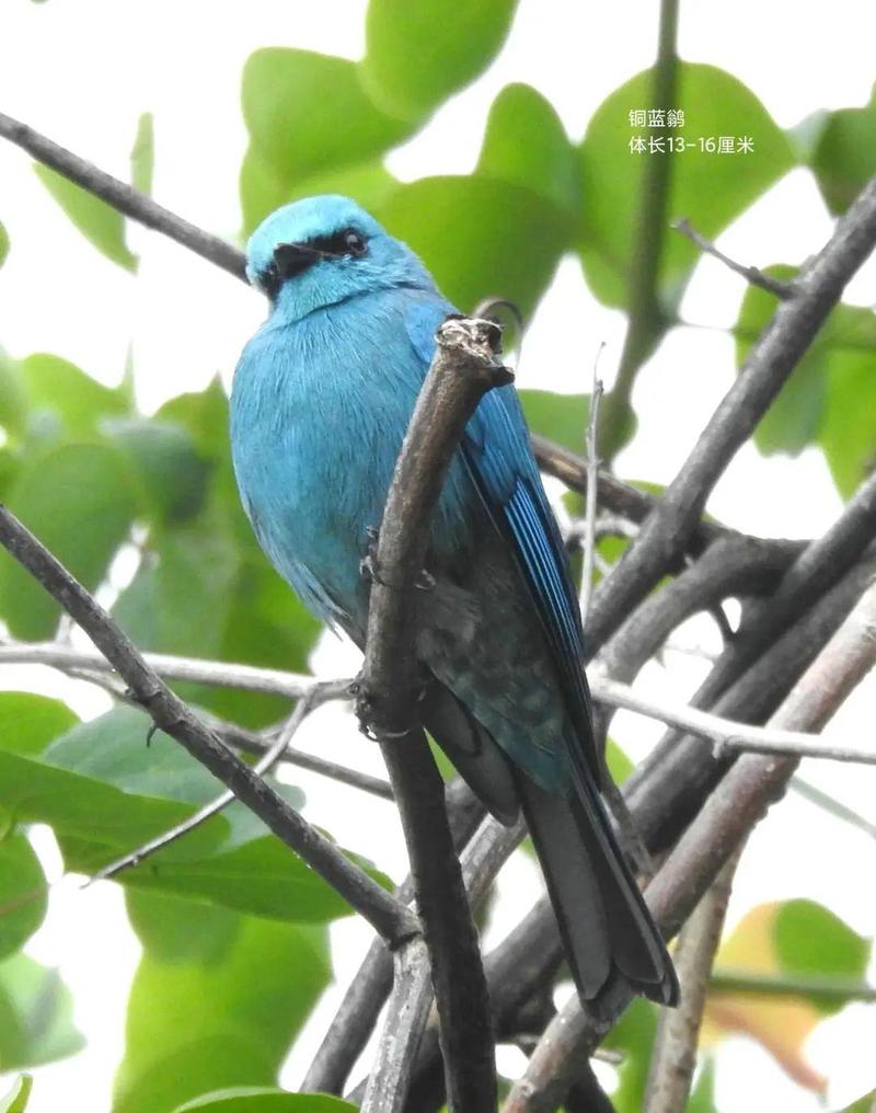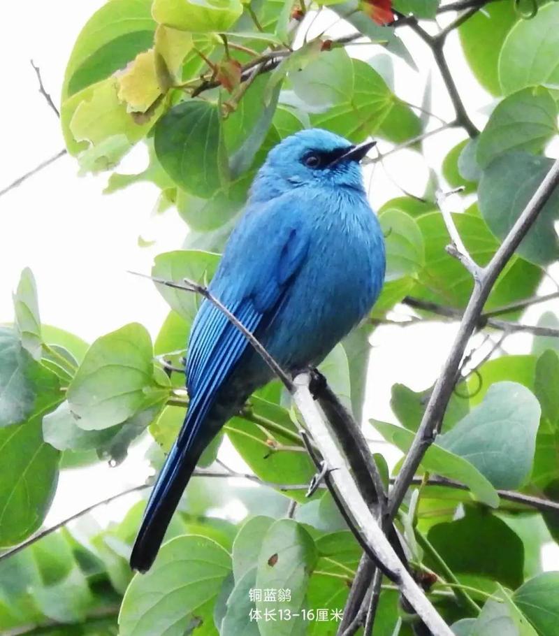 铜蓝鹟,小型鸟类,体长13~16厘米,雄鸟通体为鲜艳的铜蓝色,雌鸟和雄鸟大致相似,但不如雄鸟羽色鲜艳。 铜蓝鹟常单独或成对活动,多在高大乔木冠层,也到林下灌木和小树上活动,但很少下到地上。性大胆,不甚怕人,频繁地飞到空中捕食飞行性昆虫,也能像山雀一样在枝叶间觅食。鸣声悦耳,早晨和黄昏鸣叫不息。