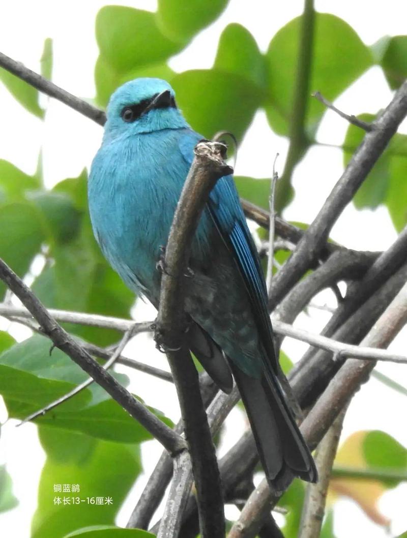 铜蓝鹟,小型鸟类,体长13~16厘米,雄鸟通体为鲜艳的铜蓝色,雌鸟和雄鸟大致相似,但不如雄鸟羽色鲜艳。 铜蓝鹟常单独或成对活动,多在高大乔木冠层,也到林下灌木和小树上活动,但很少下到地上。性大胆,不甚怕人,频繁地飞到空中捕食飞行性昆虫,也能像山雀一样在枝叶间觅食。鸣声悦耳,早晨和黄昏鸣叫不息。