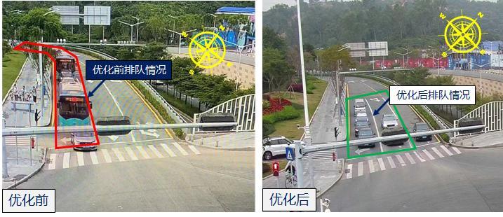 致远中路/留仙大道路口作为南山片区居民前往深圳北站的重要交通节点,春运期间大量车辆需要通过留仙大道右转至致远中路,为应对春运期间前往北站车流的增加,蜀黍优化了路口绿信比,增加了右转车辆的绿灯通行时间,同时协调区交通运输部门,增设了一条右转车道。经观察,优化后,致远中路/留仙大道路口右转排队长度下降,右转通行效率提升了80%以上。