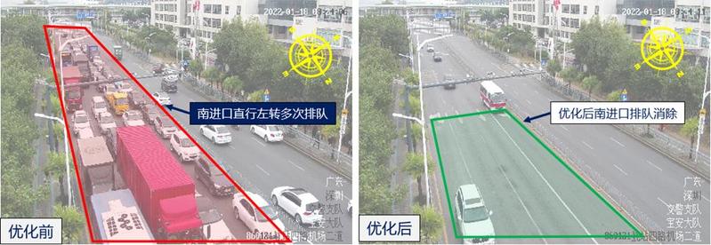 航站四路/机场二道路口位于宝安机场片区。近期,通过航站四路北行左转往机场的车流逐渐增多,致使该路口南进口存在多次排队现象。蜀黍优化了绿信比,增加了南进口的车辆绿灯通行时间,并利用步伐保持手段,持续疏解路口,加快排队车流疏散。优化后,航站四路/机场二道路口车辆排队现象消除。