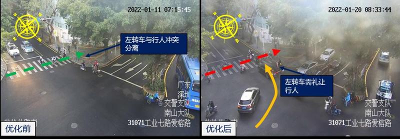 爱榕/工业七路口位于南山蛇口招商片区,路口北侧为育才二中和育才二小,寒假开始后该路口行人流量大幅下降,蜀黍取消了行人专用相位,采用机动车与同向行人混合放行,右转机动车礼让行人的放行模式。优化后,路口通行能力提高,机动车平均延误从89.5秒下降至60.5秒,降幅32.4%。