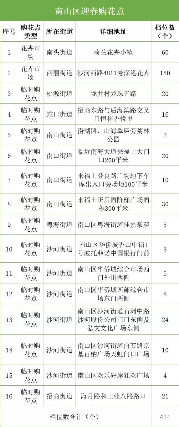 花卉地点:南山区目前共设置16个购花点、424个档位