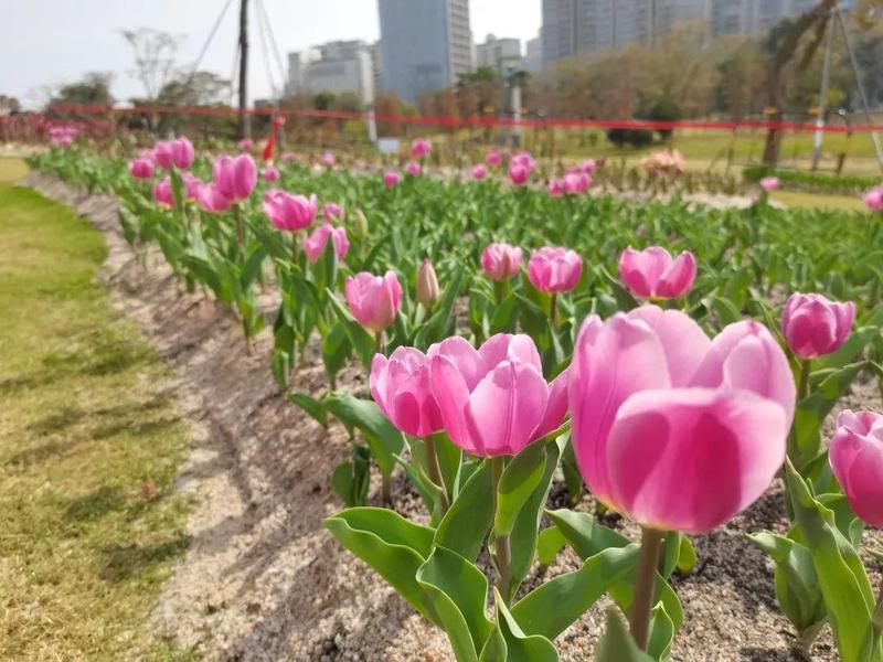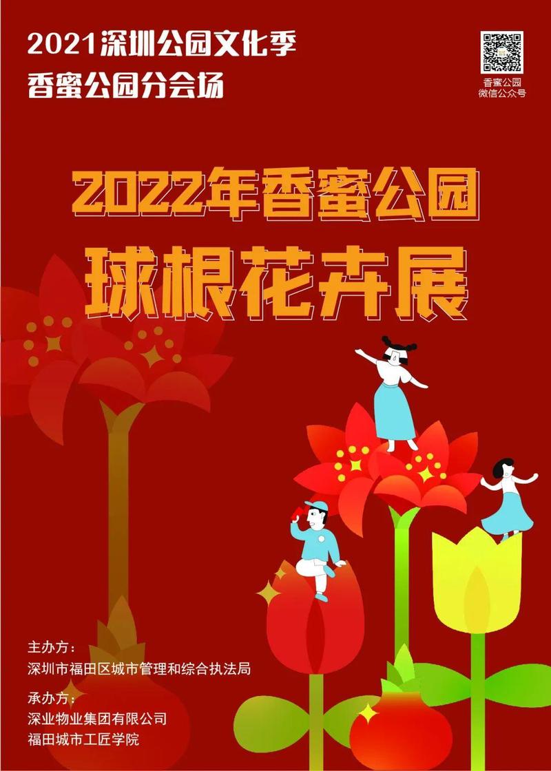 2022年香蜜公园球根花展以“朱顶玄英好运出,红绽青阳旺鹏城"为主题,主要展示朱顶红及郁金香共39个品种。将在花香湖沿岸种植3万4千株种球,种植总面积约为520㎡。