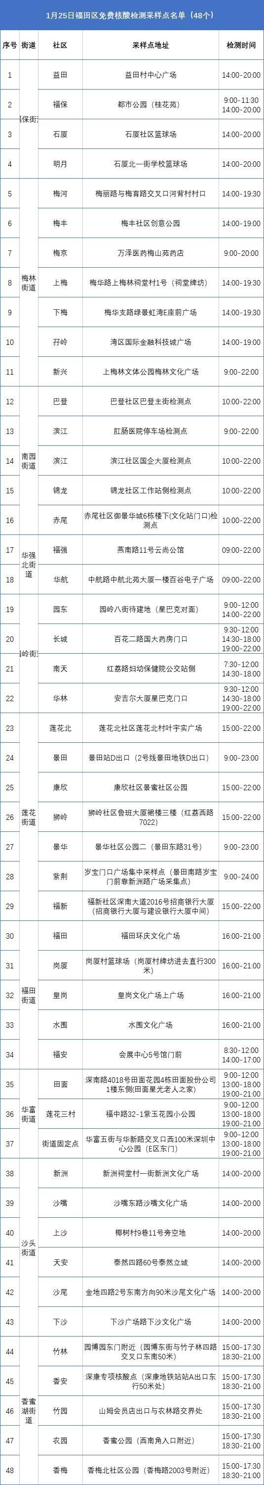 更新!1月25日福田区设置48个免费核酸检测采样点