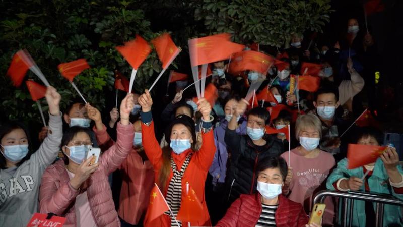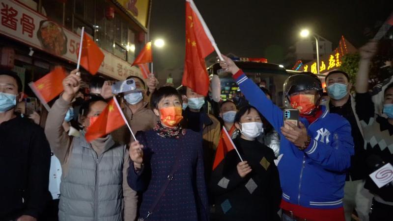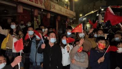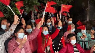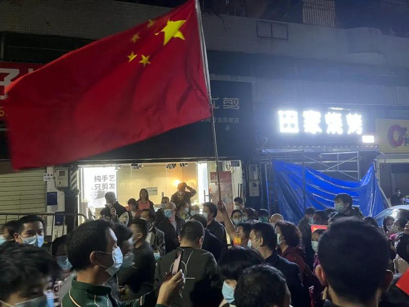 封控区内的居民们挥动手中的国旗