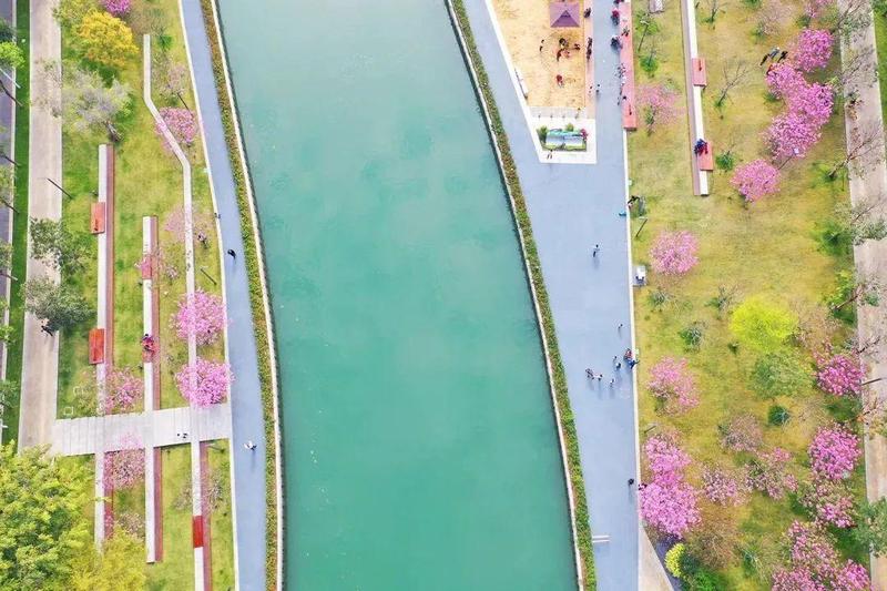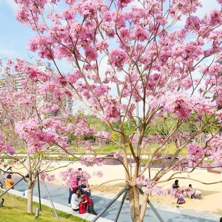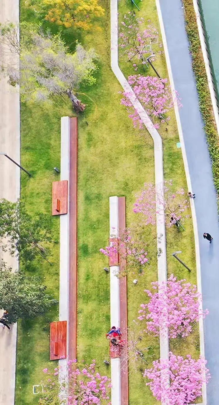 园区内,种植了紫花风铃木、火焰木等特色景观乔木,风光旖旎。