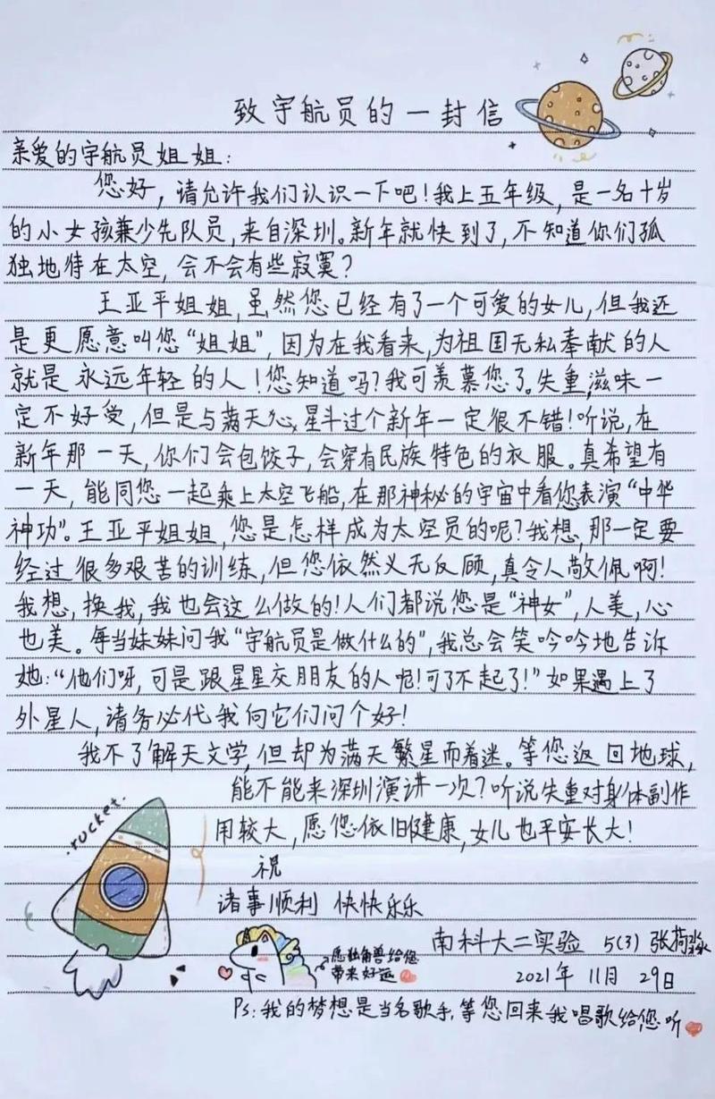 1月24日,“中国载人航天”官方微信公众号刊登南方科技大学第二实验学校(简称“南科大二实验”)学生投递的作品。