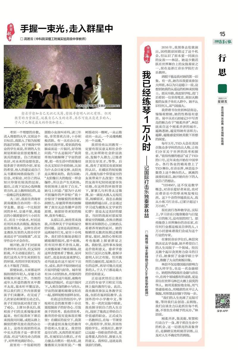 当时的我面对那双望着星空的眼睛,企图点燃那颗有求知欲的心,让她抬头看着养育她的星河。她的眼睛曾无数次抚摸过璀璨群星,彼时,她的心智和思考也能踏上探索群星之路。我盼望,这件事本身就是价值和意义。