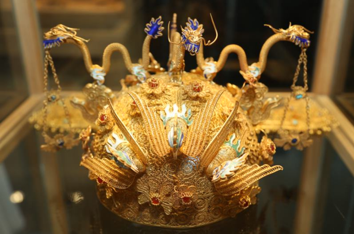 此次文博会,楚釹子品牌展出凤冠霞帔婚配系列、宅配梅兰竹菊系列、佛像系列产品等近百余件。其中凤冠霞帔系列作品,以巧妙的花丝镶嵌技艺,糅合中国传统技艺,融入现代婚纱设计理念,打造出流光溢彩、雍容华贵的现代宫廷艺术之美。