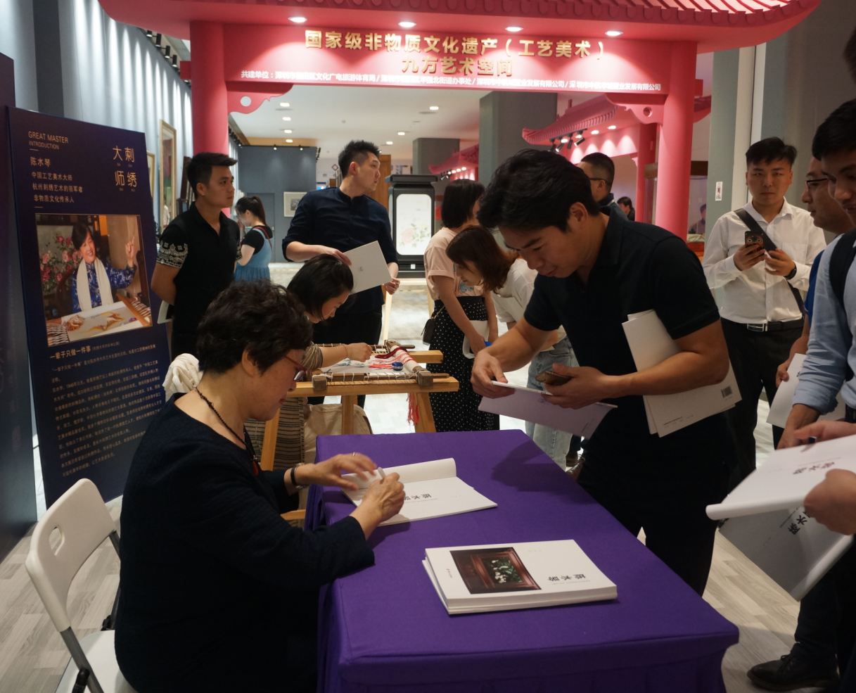 中国工艺美术大师陈水琴亲临现场,为九方艺术空间揭牌,现场指导此项技艺的传承人为现场观众进行技艺演示,同时为参加活动的嘉宾和艺术爱好者们开展签名送书活动。让更多的人了解中华民族的优秀文化遗产,向大众更好地宣传、展示杭绣这项非物质文化遗产的魅力,弘扬和传播我国的优秀传统文化。展览至19日,广大市民可前往参观,体验杭绣之美。