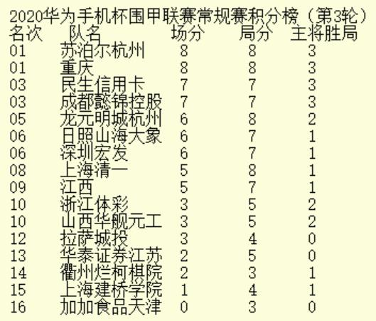 2020华为手机杯中国围棋甲级联赛第三轮深圳宏发3:1浙江体彩。具体战况如下: