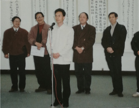 1996年组织深圳市青年书法家赴江苏省美术馆举办《深圳青年书法展》。这是深圳特区成立以来深圳青年书法家第一次到外省集体亮相交流,图为金龙在开幕式上致词。
