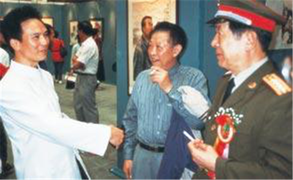 时任深圳警备区司令李友烈(右)在金龙陪同下参观画展。