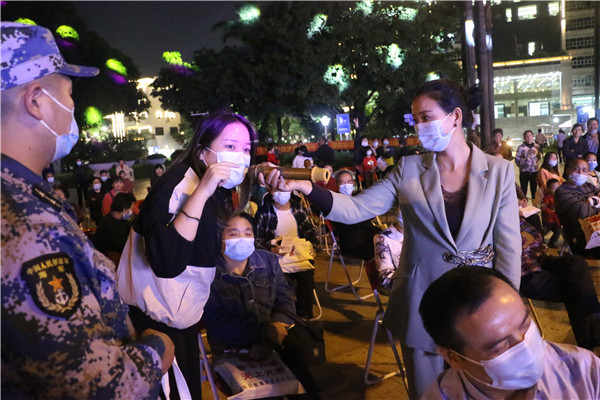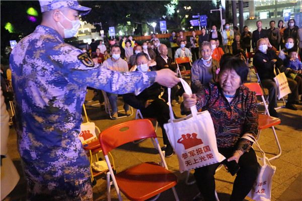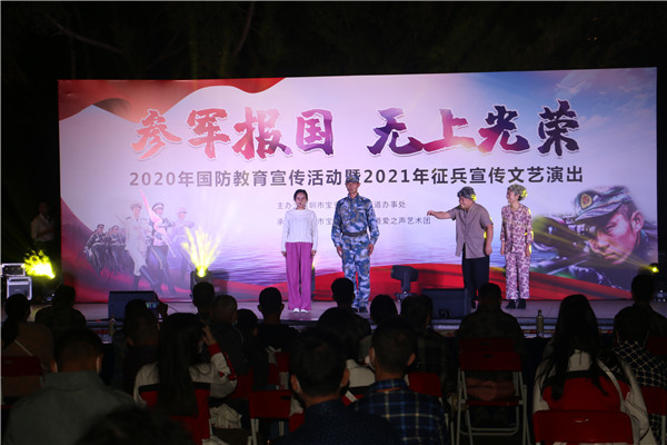 演出中间穿插着跟征兵主题相关的有奖问答环节,普及征兵和国防知识,增强活动趣味性,互动性,现场的群众踊跃参与答题。