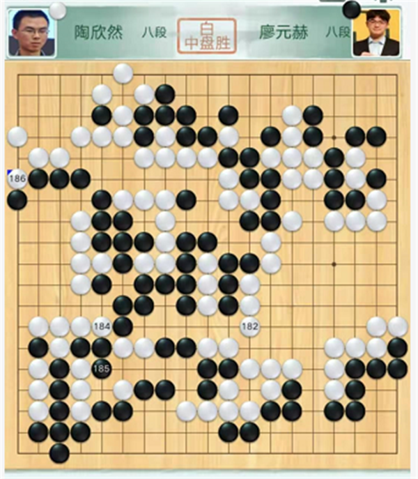 第四台慢棋,由深圳队陶欣然八段执白对阵成都队廖元赫八段。中央战斗时候白棋选择退让,反倒形成打劫,黑棋劫胜后大幅领先。之后黑棋官子阶段不够冷静细腻,几处小亏损之后被白反超。黑棋看到局面危险更加冲动的选择和白棋互相破空,结果又亏损导致差距越来越大。陶欣然执白中盘胜廖元赫。