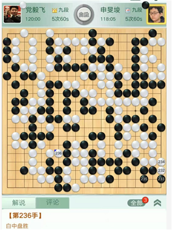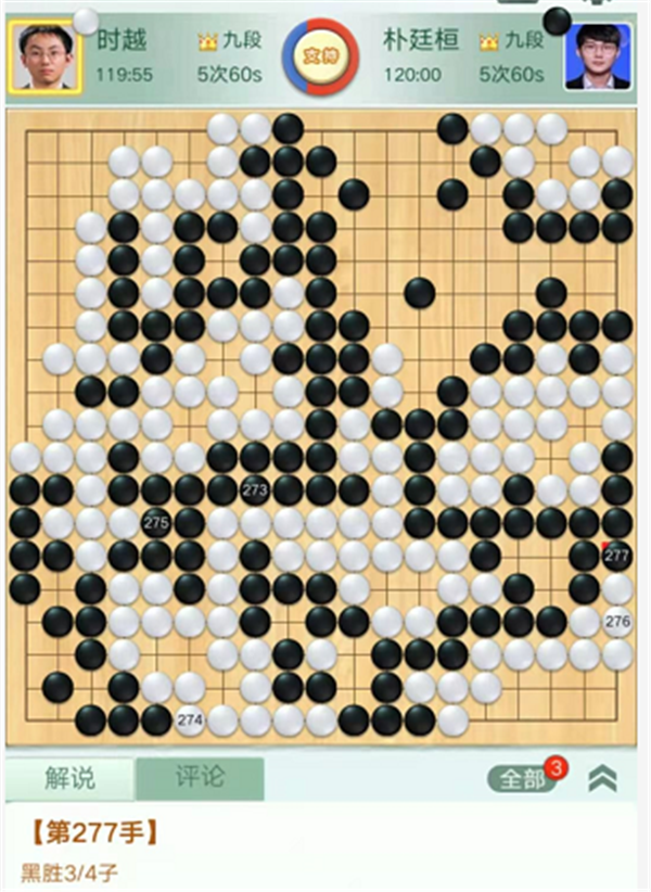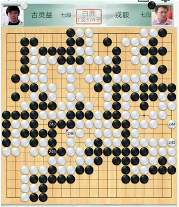 第三台快棋,深圳队的戎毅七段执黑对阵成都队的古灵益七段。黑棋开局采取取地策略。下方黑棋形状处理保守,子效重复亏损。之后黑棋一直没有明显胜机,最终以1又1/4子落败。戎毅执黑1又1/4子负古灵益。