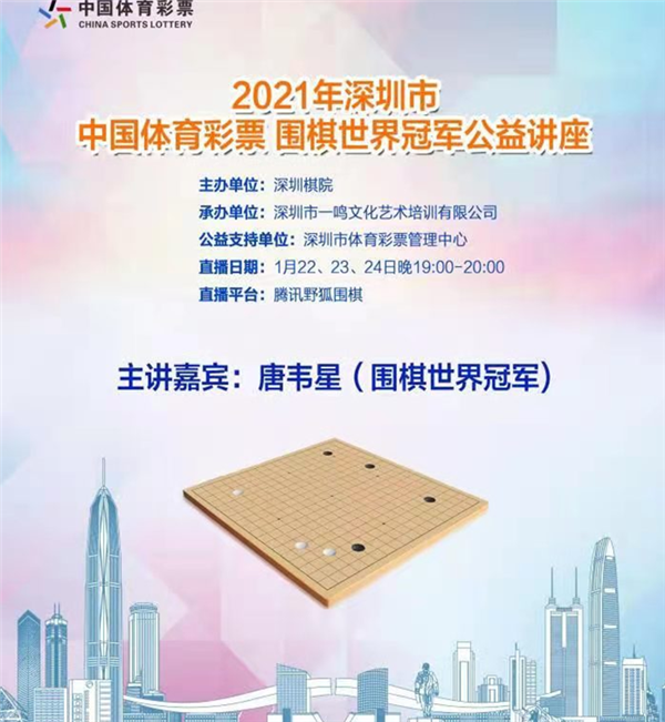 见圳客户端•深圳新闻网讯(记者周锦春)2021年1月22、23、24日连续三天晚上,由深圳棋院主办,深圳市一鸣文化艺术培训有限公司承办,深圳市体育彩票管理中心支持的“2021年深圳市中国体育彩票围棋世界冠军公益讲座”在腾讯野狐围棋平台线上举行。