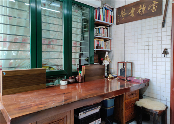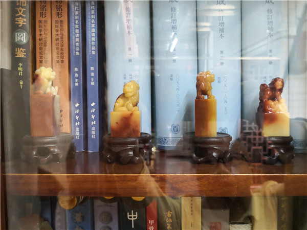 书房约莫20平米不到,摆设装点里透射出宁老师的日常。当阳光照进这间宁静的小屋,他习惯于先打开音乐,在舒心乐声中开始他一天读书、刻印的生活。累了,在小桌上喝喝茶,或弹上一段古琴,或者玩赏一下他收藏的心爱铃铛。据介绍,他专门收藏西北一带富贵人家的马铃,目前有100余个。宁老师说,“读书、养性、积德、延年”是其志向,井井有条、一丝不苟的书房就是佐证。长期的濡养,让人感到宁老师的谈吐从容、情趣高雅、思想深刻。映照在篆刻上,宁老师的印作也日渐沉稳大气,除姓名印章外,所刻内容启人心智,如“以正大立心”“以光明行事”“修辞立其诚”等等。