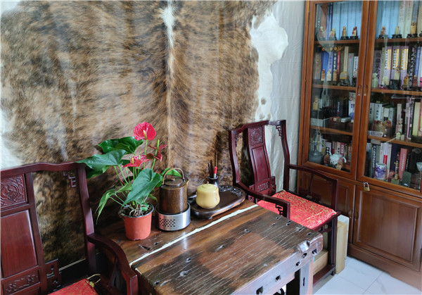 俗话说得好:见识一个素养,看看他的书房就知道了!那么,宁起兴老师的书房是什么样的呢?第一印象:简洁、古朴、有趣味。一眼扫去,临窗一张红木桌,两个装得满满的老书柜,两张乌黑发亮的南官帽椅,中间配有一张老旧的喝茶的原木桌,正上方的墙面挂着一整张大大的南美阿根廷牛皮。墙上横扫,挂有“室静书馨”的书法作品,一张古琴,一把萨克斯,几份有关他篆刻宣传的剪报,还有星星点点的各类铃铛。细看呢:书柜里的篆刻工具书,有大部头的字典、印谱和系列丛书,也有与篆刻相关的文化类书籍,大多插满了颜色各异的标签,可见宁老师读书的细致与用心。红木大桌上有一对大音箱,是原装进口的德国货;桌子旁,有一正方形的小桌特别显眼,宁老师带着些许自豪的神态介绍说,钳台是德国进口的,锯子也是原装进口的,那个刻铜印的印盘是定制的。还有,他所用的刻刀顶端印有logo,是小篆“宁”字与工字的合写,该刀钢材钴含量为17%,也是定制的。正所谓“工欲善其事,必先利其器”,宁老师深以为然。是以,他在工具上追求“高精尖”甚至不惜工本。