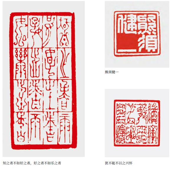 说起自己的代表作,宁老师十分谦虚,但笔者还从他的印屏、印作中,从以往宣传报道中理出了一些头绪。比如,刚来深圳,有感于邓小平同志的功绩,刻了一方《总设计师邓小平》,陈巨来的印味明显。2013年宝安区书法协会发行新年挂历上印有“蛇年大吉”印章,便出自他手。那是一方金文白文印,整体舒朗开阔,灵动高古,烂漫天成,不失为其代表作。还有,用一方印完整地刻出了268字的《心经》亦是独一无二的。他为友所刻《真善美》朱文鸟虫篆,布局疏密自然,光洁妍美,婀娜多姿,韵味无穷。元朱文白文印《熊须健一》,疏密呼应,“一”字处大片留红,与另三字形成强烈对比,“须”字三撇作美化处理,形成印眼。此印工稳爽朗,行刀如笔,耐人寻味。还有应约为著名棋手武宫正树、徐莹等所刻鸟虫篆印均“嵌入”围棋黑白二子的元素,自然贴切,又妙趣横生。还有为出版社、书局、书籍插图以及赛事配刻的印章更是数不胜数。当前,宁老师依然精神饱满、创作旺盛,相信未来还会不断有令人惊喜的印品佳作问世。