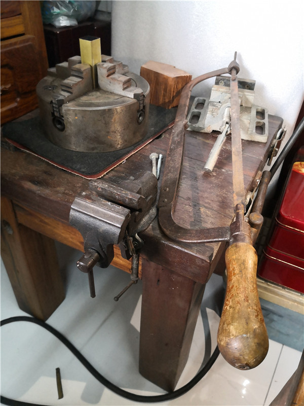 船木工作台摆的全是宁老师的心肝宝贝:进口或定制的篆刻台、锯、刀等。