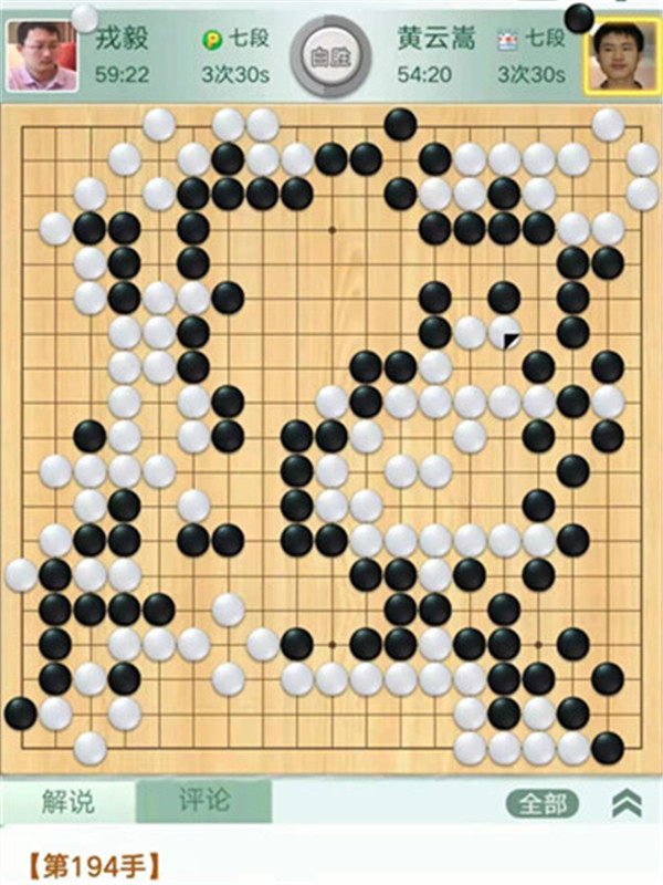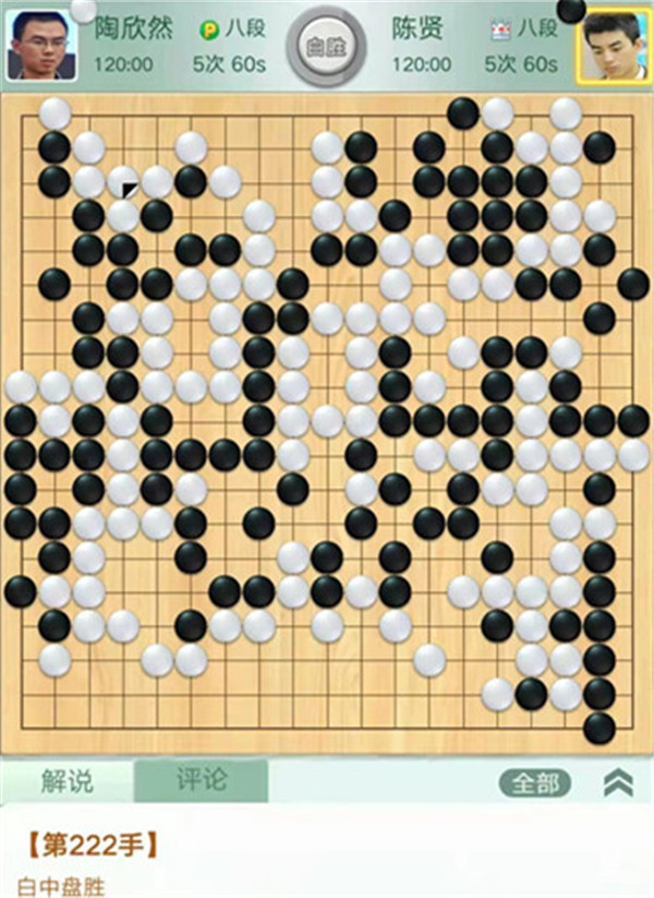 今日比赛中,申旻俊主将执黑对阵新二冠芈昱廷,开局左上角申旻俊配合小米使出芈氏飞刀,结果是飞刀不成功黑棋局面领先。中盘黑棋攻击中央白棋时,白棋脱先抢占实地。被黑手起刀落斩杀大龙,局终。快棋台,去年屡立战功的戎毅七段执白对阵黄云嵩七段,行棋稳健,占居三个角之后,又在中间活出一大块,行棋至194手胜。三台陶欣然八段对阵陈贤八段,行棋222手白中盘胜。四台时越九段对赵晨宇一战,行至284手,以四分之三子微弱优势取胜。
