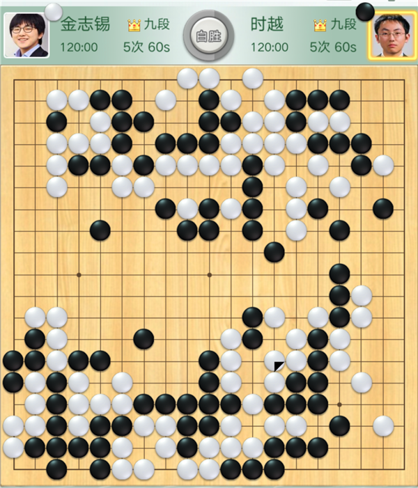 紧接着,时越执黑对阵金志锡一局传来告负的消息。纵观全局,开局时黑稍好,但中盘攻击上边白棋时候方向错误,被白棋联络后自身还留下了白棋开劫的隐患。之后黑棋在劫争中放弃上方黑子在下边围出大模样争胜。白棋在黑势中施展手段时黑棋必需寻求净杀白子。无奈周边不够厚实杀不掉,遂于174手时认负。