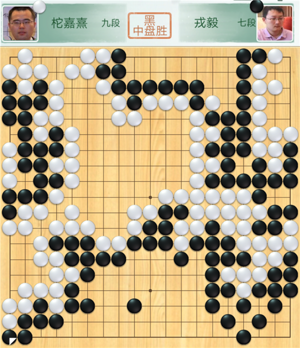 不过,接下来喜讯再次传来:戎毅快棋执黑赢了世界冠军柁嘉熹。深圳龙华队至此奠定胜局,至少是2:2主将胜,拿两分。这一局,中盘时白棋在中央寻求作战,黑棋正面应对则局面有利。实战黑棋避战抢占右边,中央白棋先动手后白棋领先。但在之后官子争夺战中,白棋失误频频,黑棋遂幸运小胜。