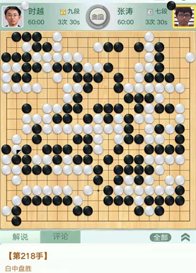 时越快棋执白对阵张涛。右边作战时候,黑棋没有选择造劫劫争而是退让,被白将右边几子吃掉后又吃掉右上黑棋,黑棋局面落后。之后黑棋右下又死活看错被白先手活出,导致雪上加霜,实际上棋局已经结束。