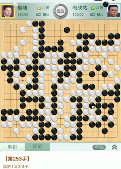 陶欣然执黑对阵檀啸。中盘白棋在右边下出缓手,导致攻守逆转,白棋被迫做劫求活。黑棋利用劫争中央连走两手获利巨大。之后黑棋稳健收官将优势保持至终局。