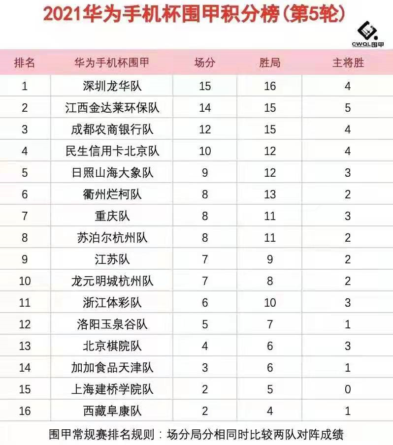 第五轮各队战况如下:衢州烂柯4比0胜加加食品天津;浙江体彩队1:3深圳龙华队;日照山海大象队1:3江西金达莱环保队;重庆队3比1民生信用卡北京队;成都农商银行队3:1胜江苏队;西藏阜康2:2主将胜上海建桥学院;北京棋院队2:2主将胜洛阳玉泉谷队;苏泊尔杭州2:2主将负龙元明城杭州。第一阶段结束,深圳龙华队五战全胜积15分居“魁首”,江西金达莱环保队仅以一分之差紧随其后,成都农商银行队积12分居第三位。