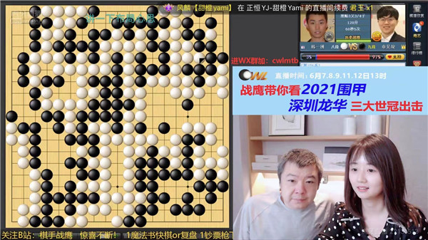 今日大局好,教练罗洗河心情自然好。于是兴高采烈地去虎牙直播和战鹰侃棋了。战鹰是职业二段,女子围甲主力选手,人美、棋强、口才好,虎牙直播间围棋知名主播,是深圳龙华队网上直播合作人。深圳龙华队后续比赛将持续在虎牙平台直播,欢迎大家关注哦!