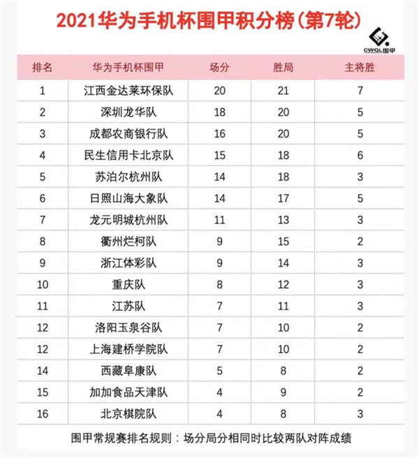 见圳客户端•深圳新闻网2021年6月8日讯(记者周锦春)华为手机杯男子围甲联赛16支队伍今日继续在浙江长兴捉对进行第七轮的厮杀。继第二阶段首轮失利后,今日的深圳龙华队似乎找回了第一阶段五连胜的感觉,以3:1战胜北京棋院队,从昨天的积分榜第三位前进了一步,重拾升势位居第二。江西队依然神勇,以3:1击败洛阳队,继续领跑积分榜。