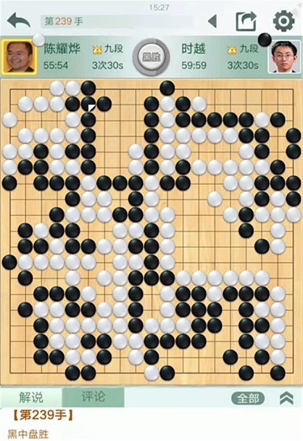 时越快棋执黑对阵世界冠军陈耀烨。中盘黑棋在右边白势中试应手,白棋应对松缓,被黑棋先手便宜十几目棋,黑局面领先。之后黑棋行棋严谨,中盘获胜。