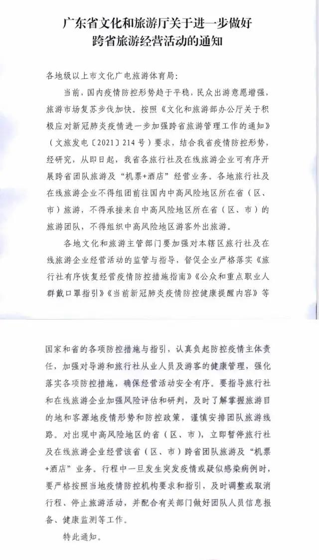 深圳新闻网2021年8月25日讯 (记者 田志强)广东省文化和旅游厅今日发布《关于进一步做好跨省旅游经营活动的通知》,通知明确:从即日起,我省各旅行社及在线旅游企业可有序开展跨省团队旅游及“机票+酒店”经营业务。各地旅行社及在线旅游企业不得组团前往国内中高风险地区所在省(区、市)旅游,不得承接来自中高风险地区所在省(区、市)的旅游团队,不得组织中高风险地区游客外出旅游。