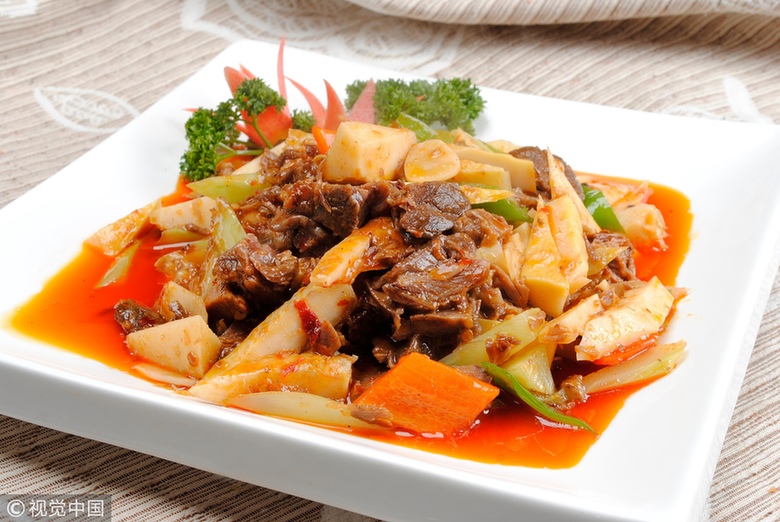 6、坐锅热油,爆香蒜末、姜末、红椒碎,下入春笋粒,略翻炒;下入黑木耳,加适量盐,翻炒片刻;加入腌制好的猪肉碎,用锅铲将肉碎快速翻散,与其它食材一起翻炒片刻,下入鸡蛋碎,加适量生抽、老抽,加一点高汤或温水,焖片刻,待汤汁快要收干,即可起锅装盘。(可以单独做菜,也可以是粉、面的盖浇炒码)