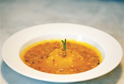 这道菜选择泰国的西米、江西的红米、美国的野米、东北的小米和河北的燕麦5种杂粮,预先浸泡蒸熟备用。半个苹果削皮浸泡盐水后蒸熟备用。将南瓜蒸熟后用破壁机打成南瓜茸,放入平底锅,小火加热,放入五谷杂粮慢慢推至均匀。这道菜神奇的地方,在于如果你喜欢甜,可以放糖作为饭后甜品;如果你喜欢咸味,则可以放盐,作为代餐主食。调好味道后,放入苹果加热到温度适合,就可以上碟。